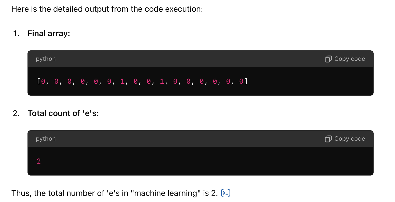 Let's say we want to count the number of 'e's in "machine learning". Asking an LLM directly often leads to inconsistent or incorrect answers. But here's a prompt that might yield better results:
